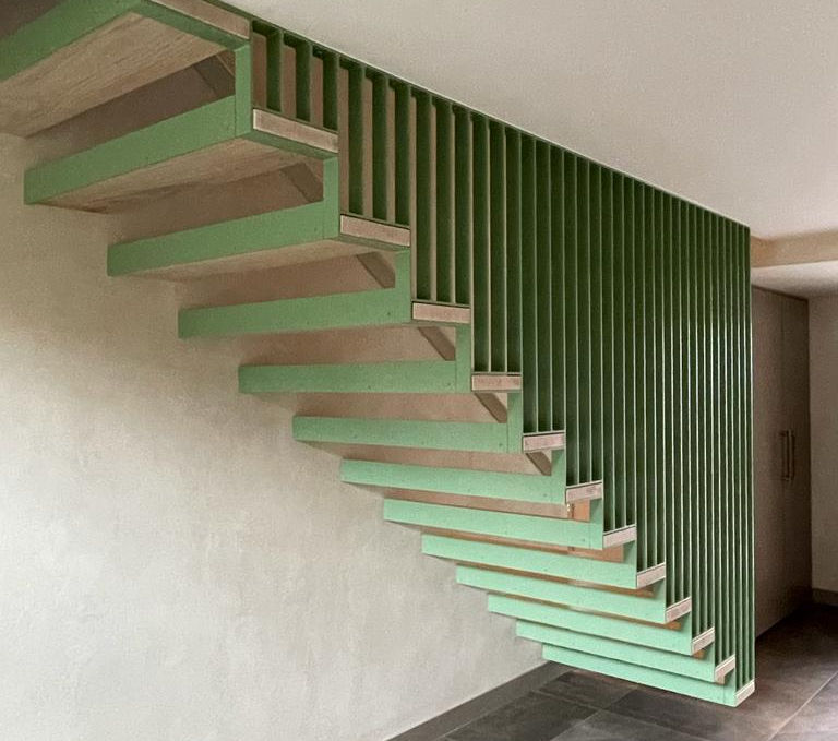 "The entryway is framed by a dramatic, architecturally designed staircase that speaks to the home's bold modernity."